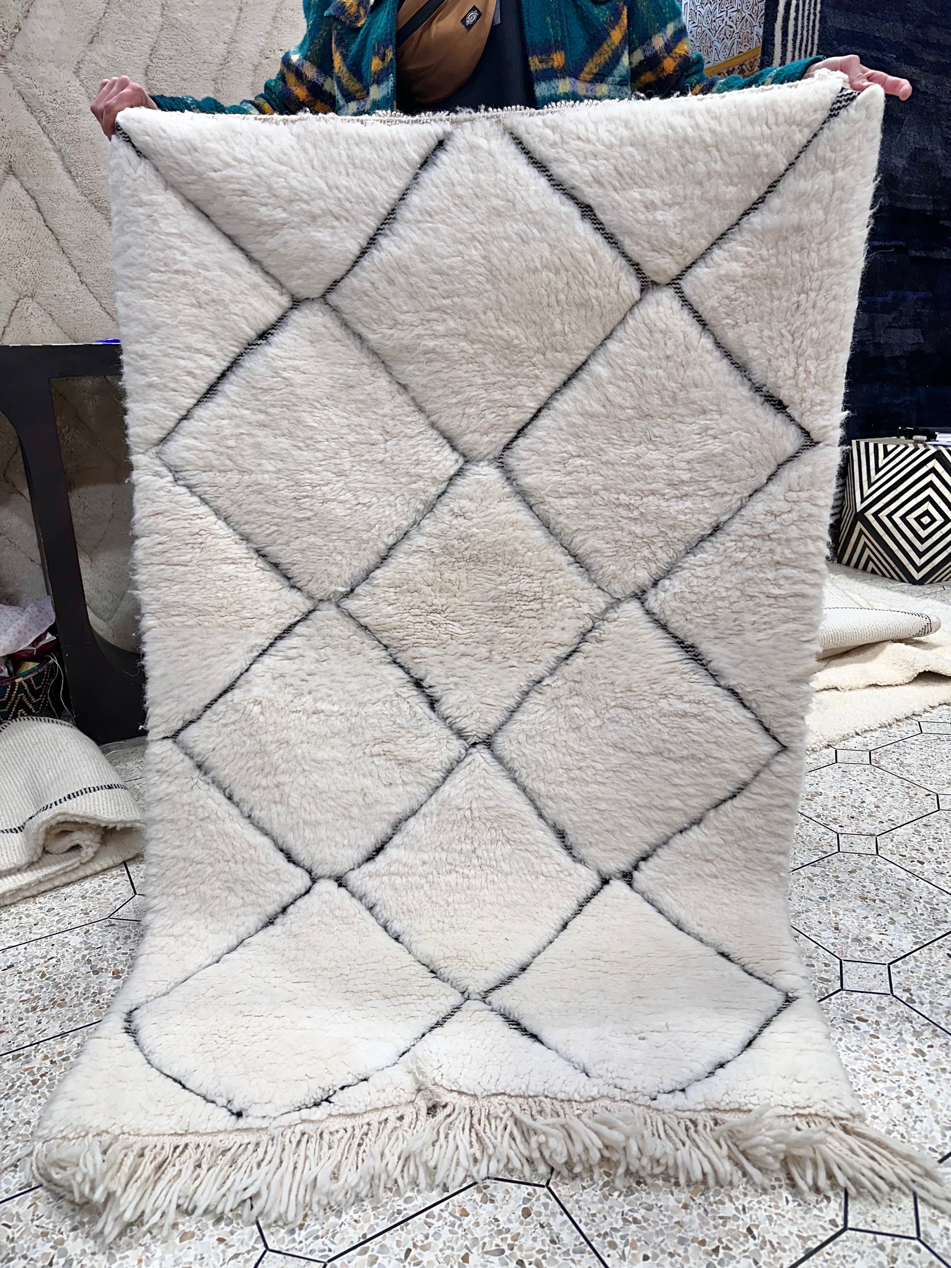 Ce tapis est un Beni ouarain tissé avec la laine du Mrirt, les Mrirt sont considérés comme les plus beau tapis du Maroc. Leur laine est appréciée pour son extrême douceur.