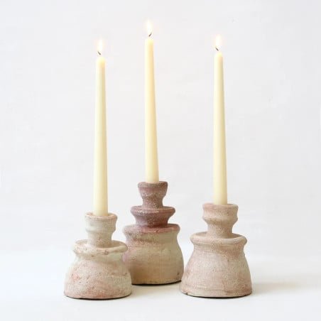 Ces bougeoirs en terracotta à l'aspect particulièrement brut et authentique sont des pièces uniques. Chaque bougeoir développe une teinte et des nuances différentes, du crème, en passant par le rosé au gris foncé brun. Ils sont fabriqués à la main en Tunisie par nos potiers partenaires. Leurs savoir-faire et les caractéristiques des terres chaudes de la région offrent aux bougeoirs une patine et une texture naturelles qui leur sont propres. Ils apporteront une ambiance méditerranéenne chaleureuse et une jolie touche bohème à votre intérieur. La fabrication artisanale induit des petites imperfections liées au procédé de production manuel.