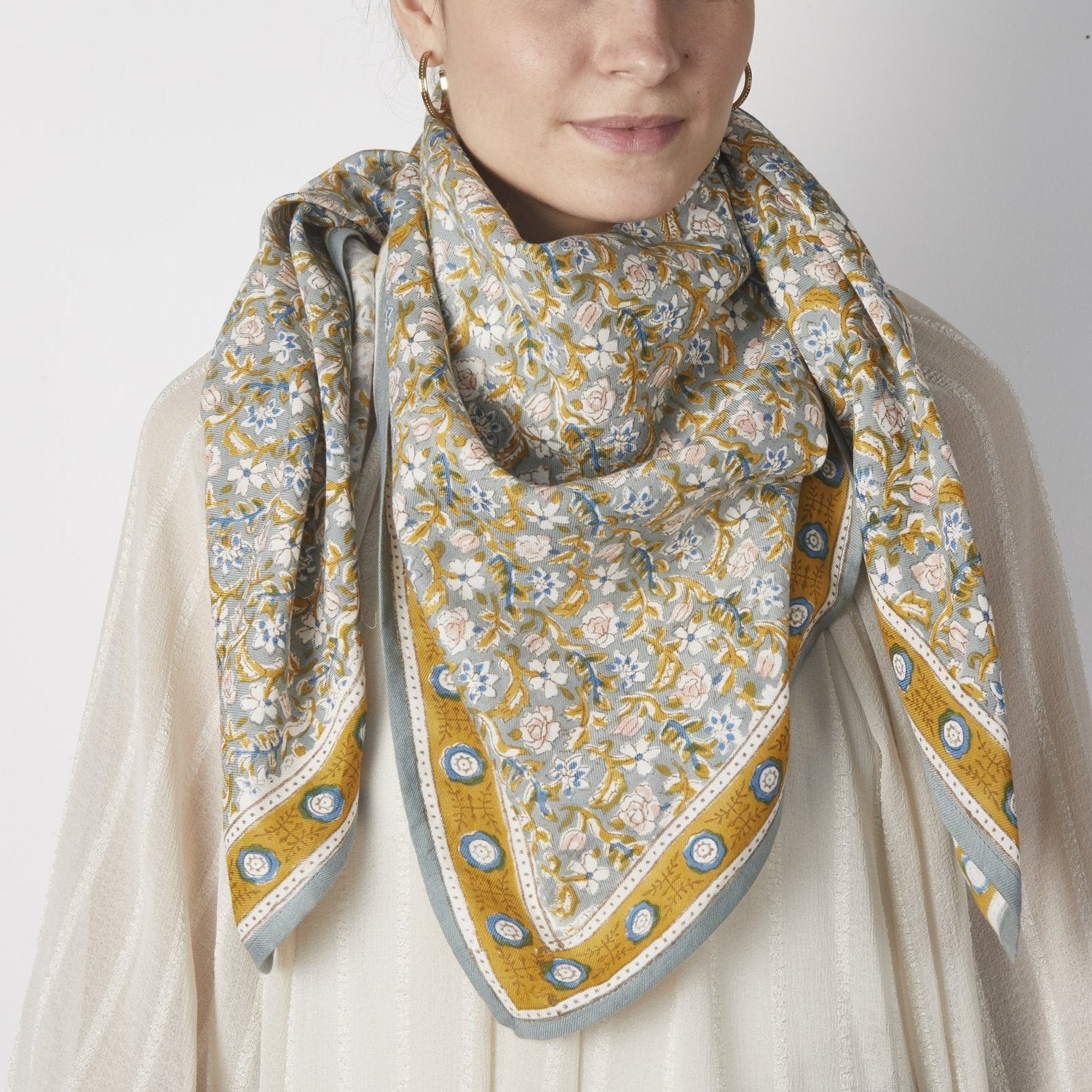 Foulard imprimé fleurs avec la technique indienne du blockprint