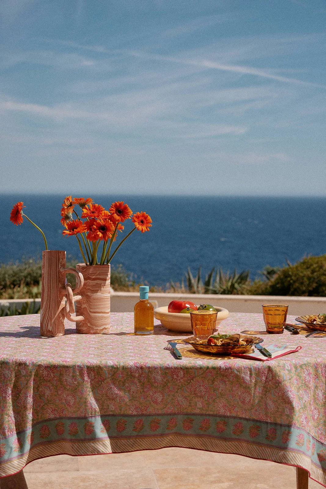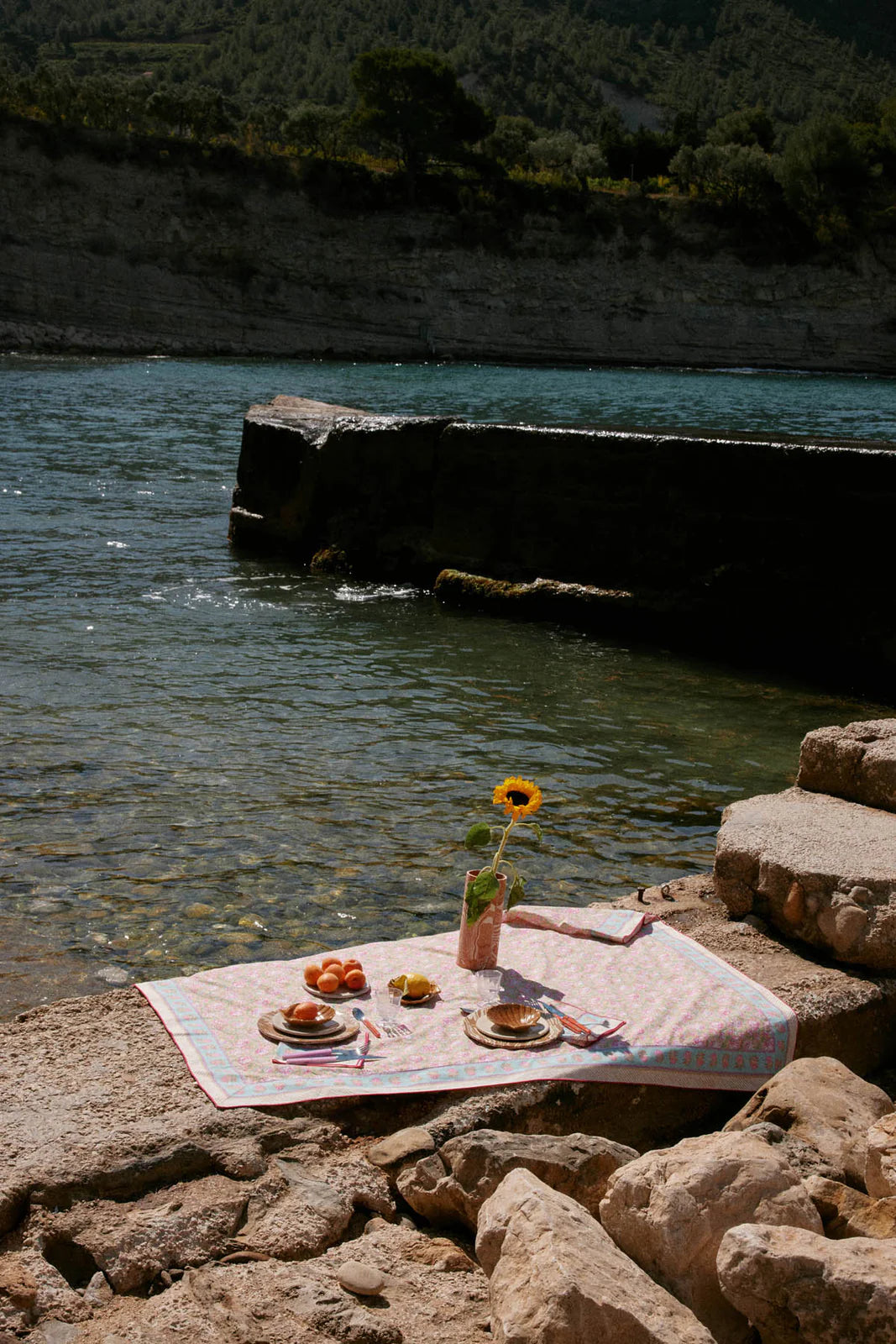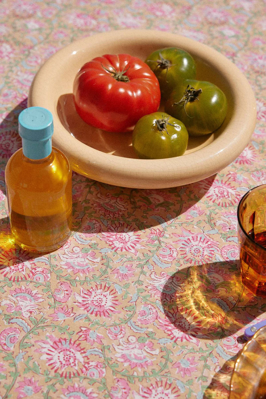 Imprimé fleuri sur le dessus et frises rapportées sur les contours.