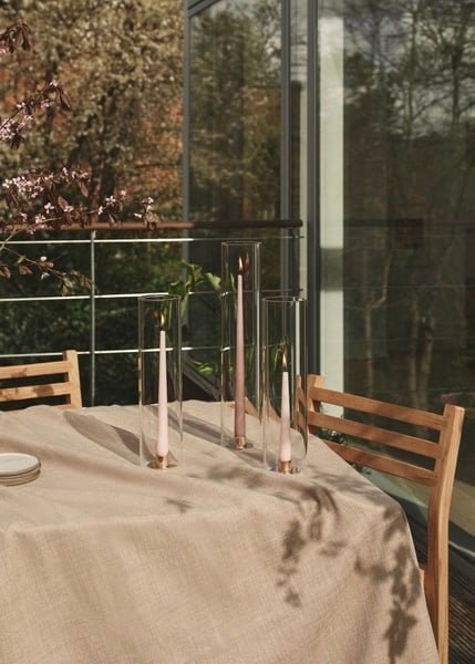 Le photophore d'une hauteur de 35 cm s'adapte à toutes les bougies effilées et cylindriques d'une hauteur maximale de 32 cm. Les trois petits trous d'aération en bas du verre assurent une constante belle flamme de la bougie pour les tables extérieures. Nous avons également testé les verres à l'intérieur, mais dans certaines maisons, la circulation de l'air n'est pas suffisante, la flamme ne reçoit donc pas autant d'air qu'elle en a besoin et la flamme vacille. Ce n'est pas le cas lorsqu'elles sont utilisées à l'extérieur où l'air circule et où les bougies brûlent magnifiquement.