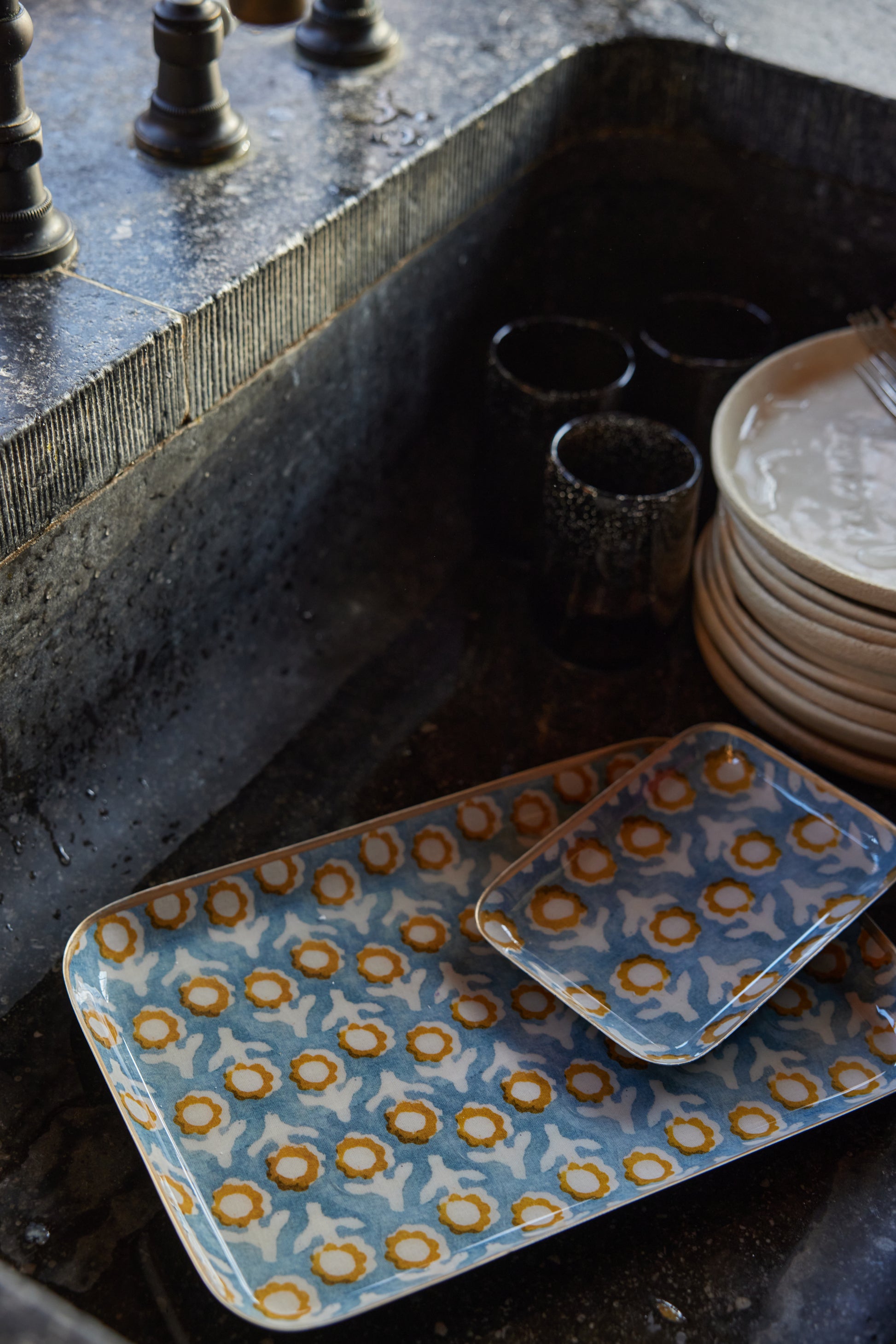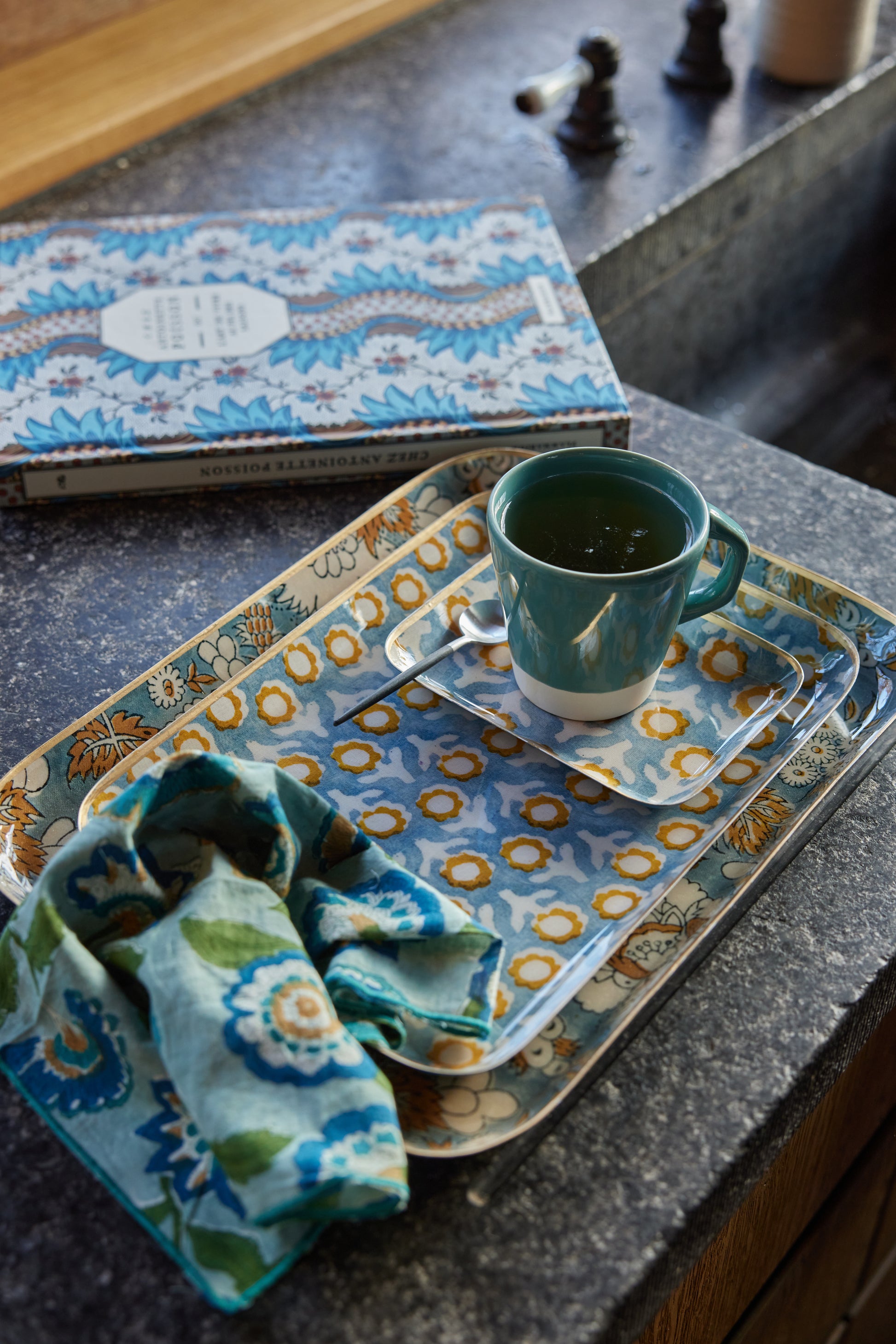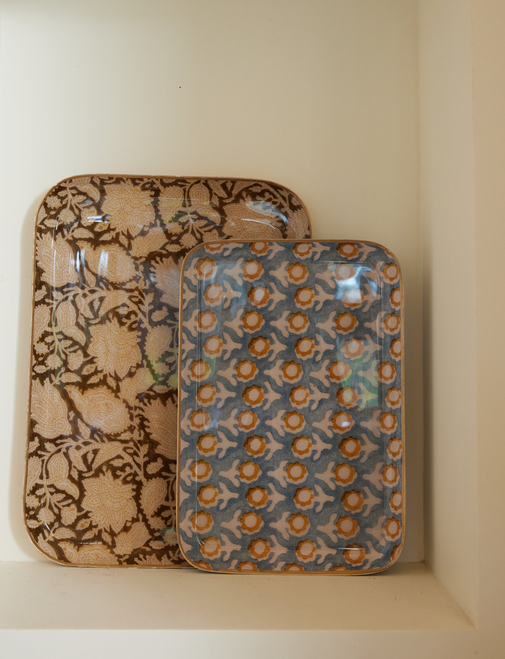 Plateaux conçus en métal émaillé avec une bordure dorée à la main. C’est une pièce unique, façonnée des mains des artisans Indiens ce qui lui confère des irrégularités.