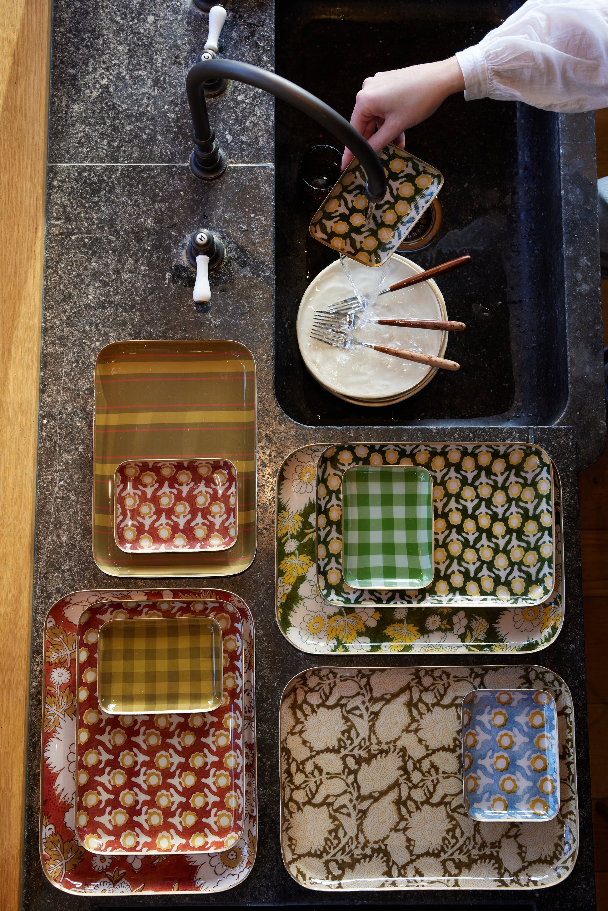 Plateaux conçus en métal émaillé avec une bordure dorée à la main. C’est une pièce unique, façonnée des mains des artisans Indiens ce qui lui confère des irrégularités.