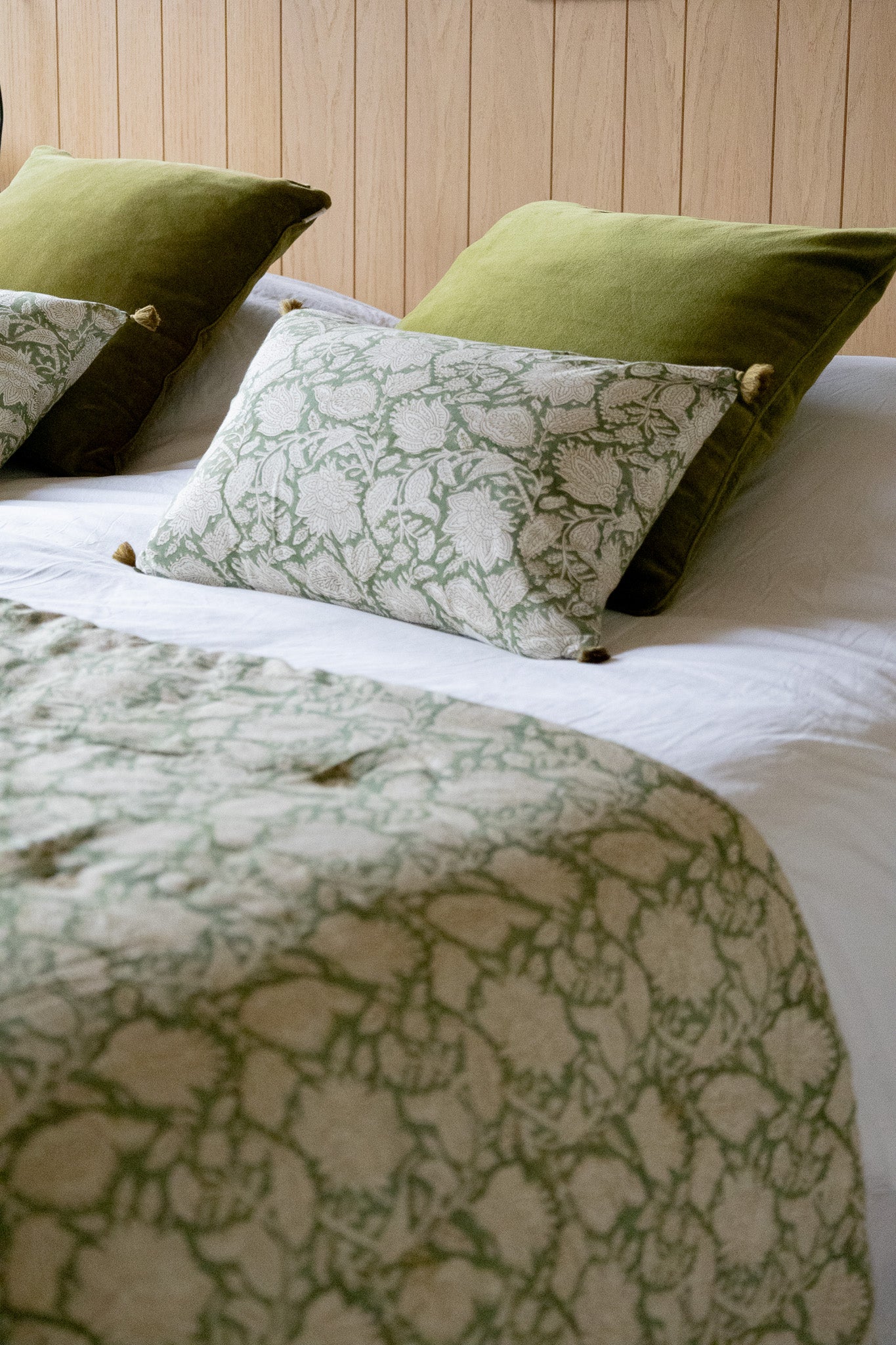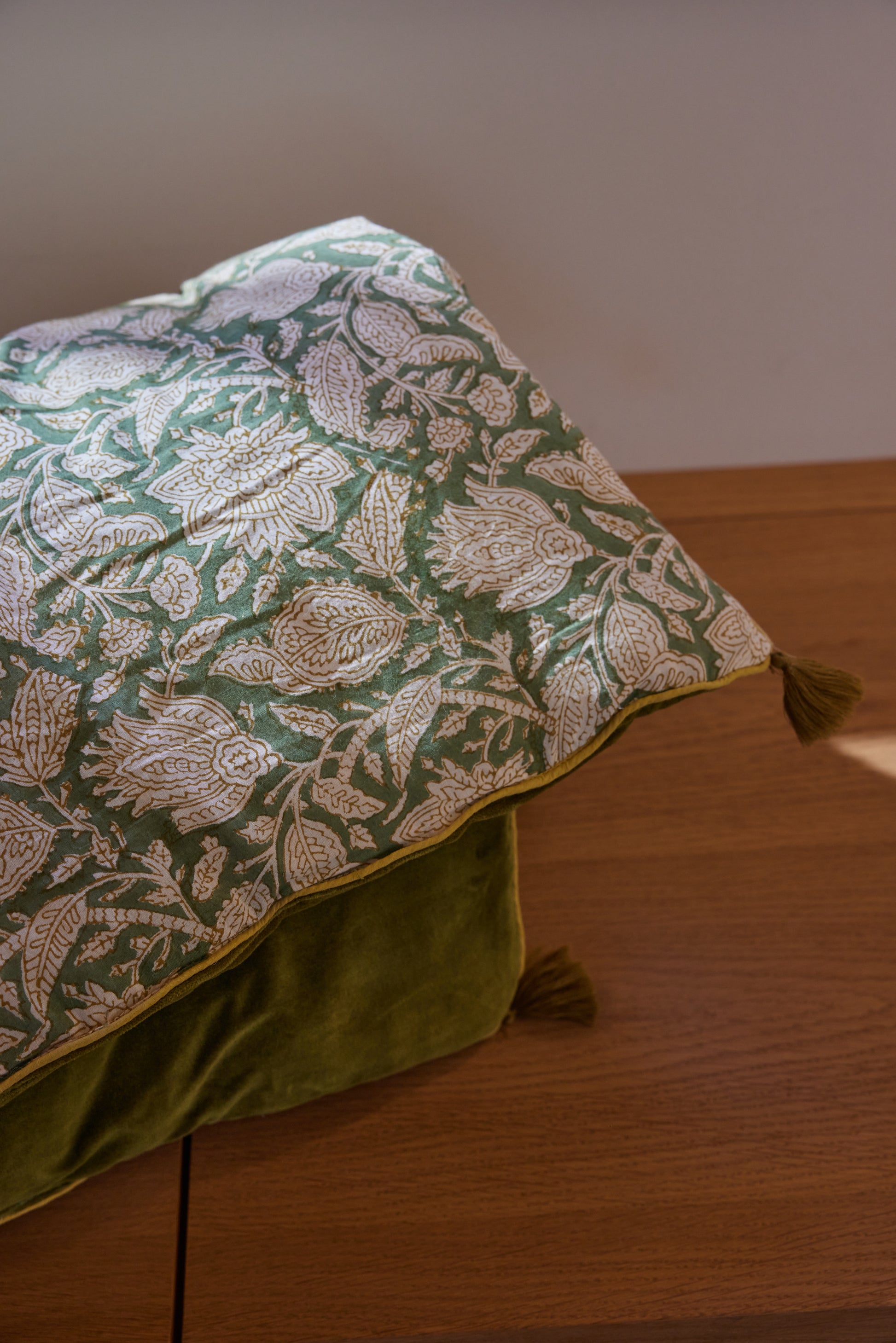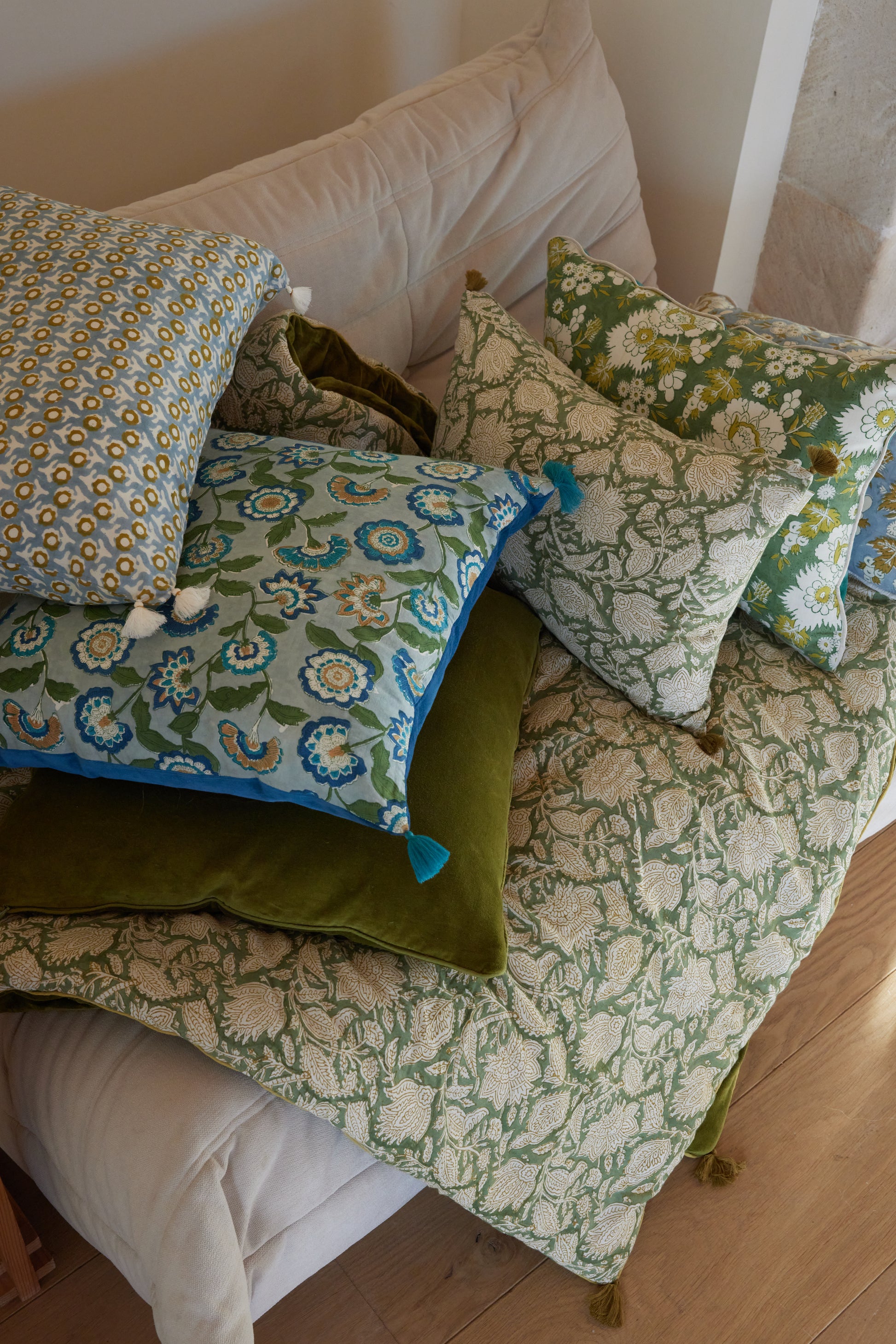 Fleurs indiennes bohèmes, imprimé au block print, révélateur du savoir faire artisanal indien sur une face et velours tout doux sur l’autre face.