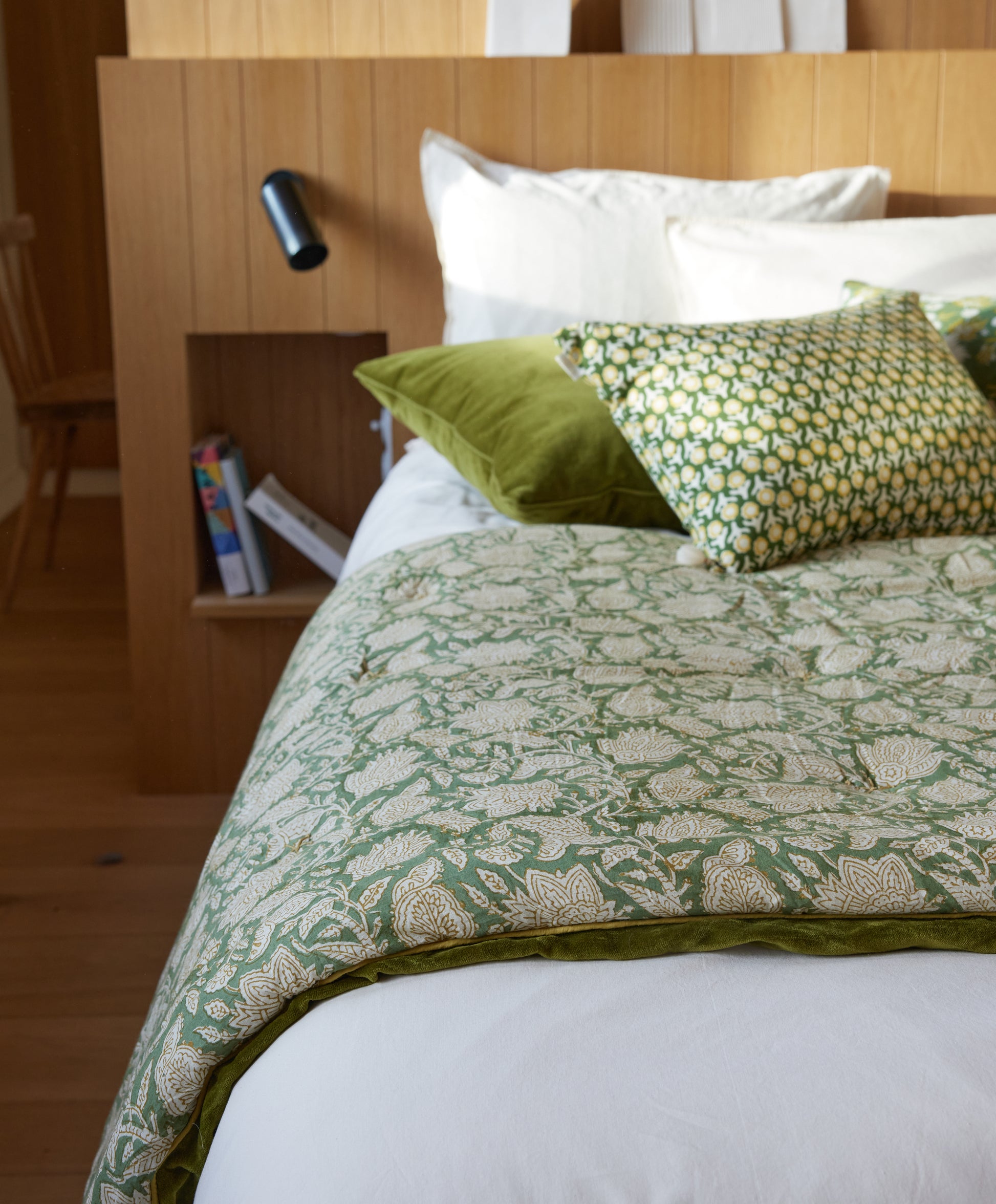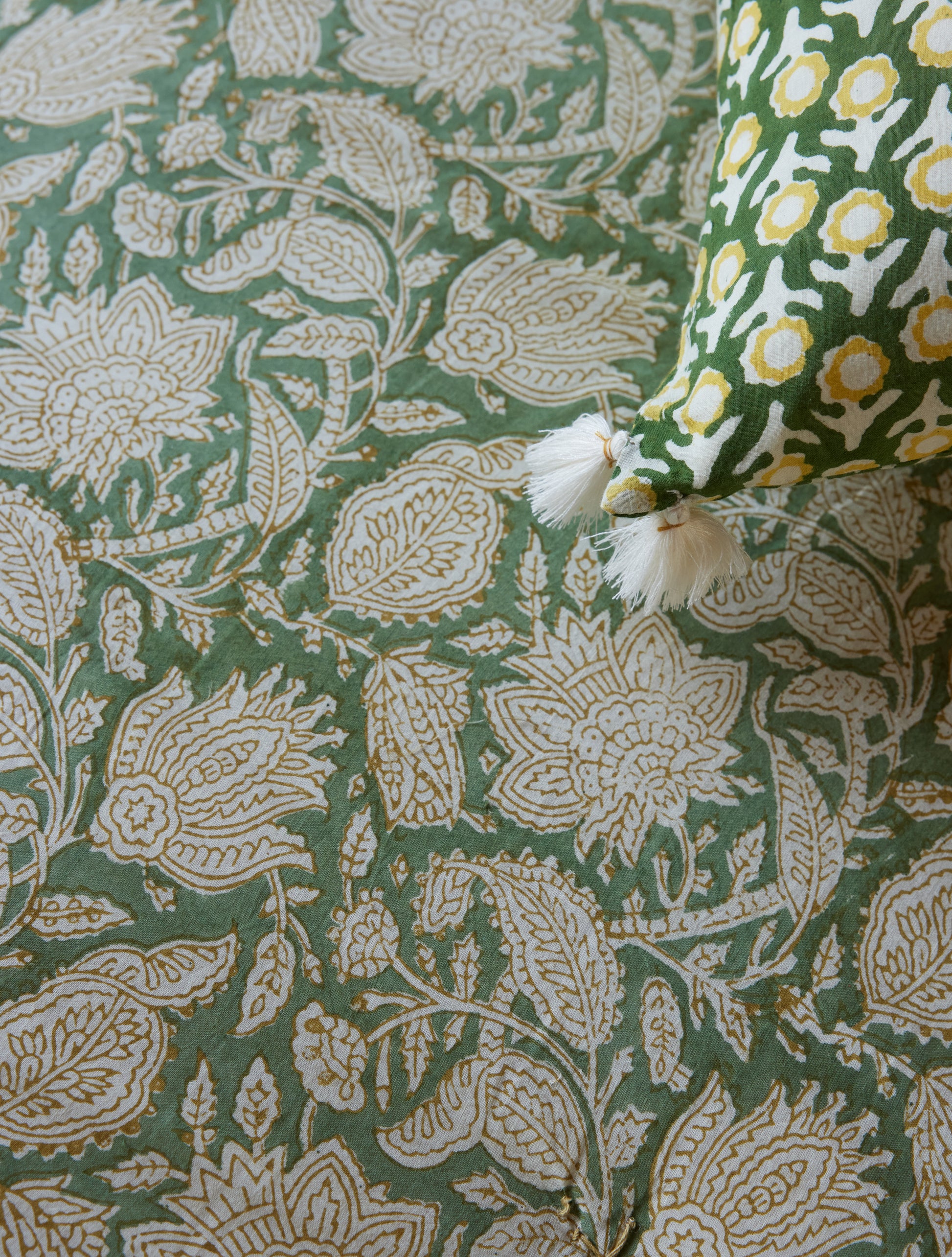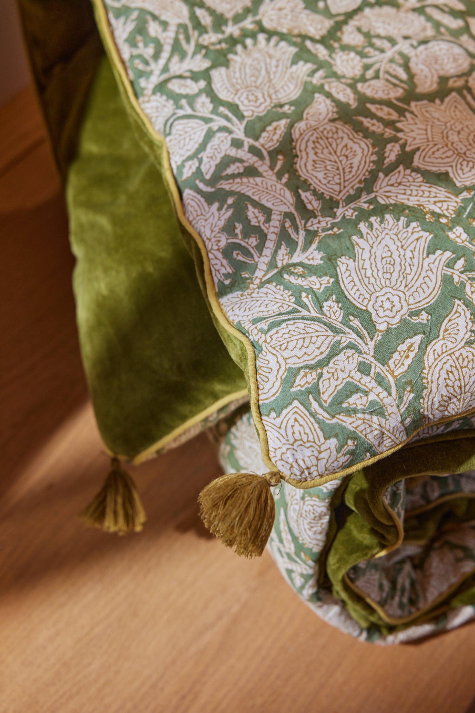 Fleurs indiennes bohèmes, imprimé au block print, révélateur du savoir faire artisanal indien sur une face et velours tout doux sur l’autre face.