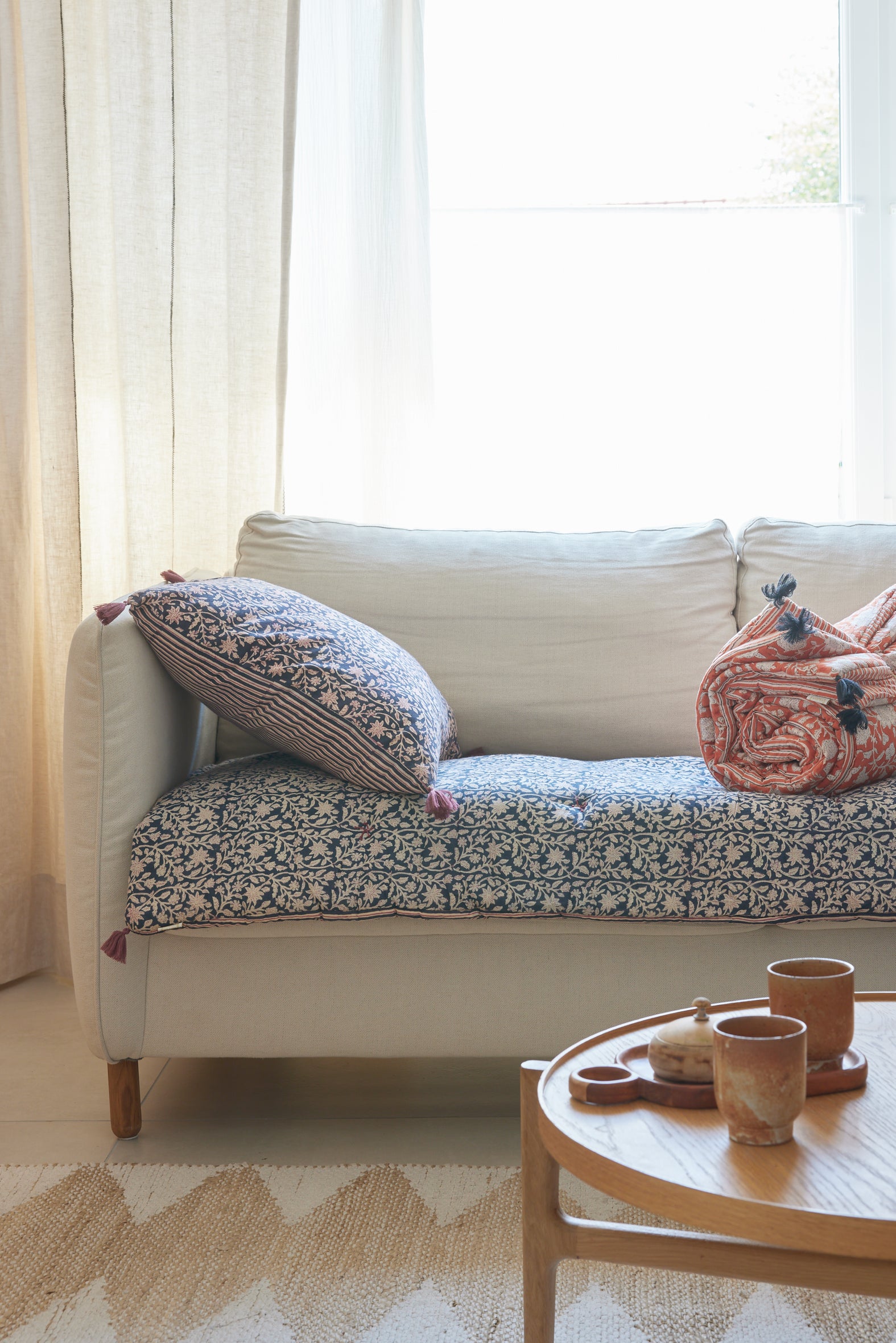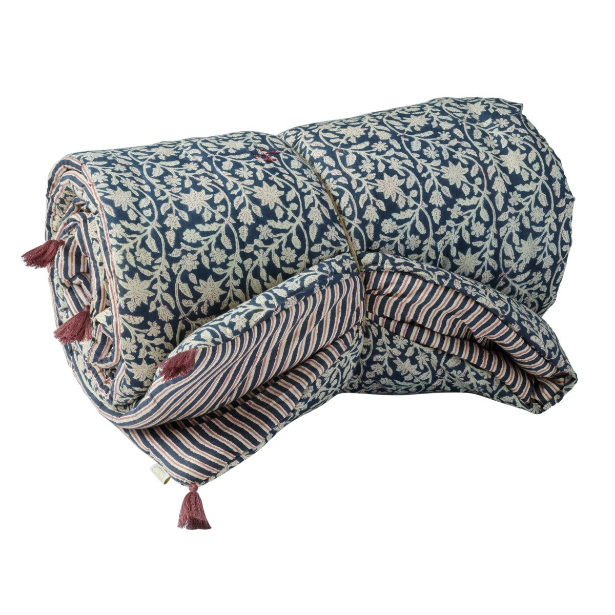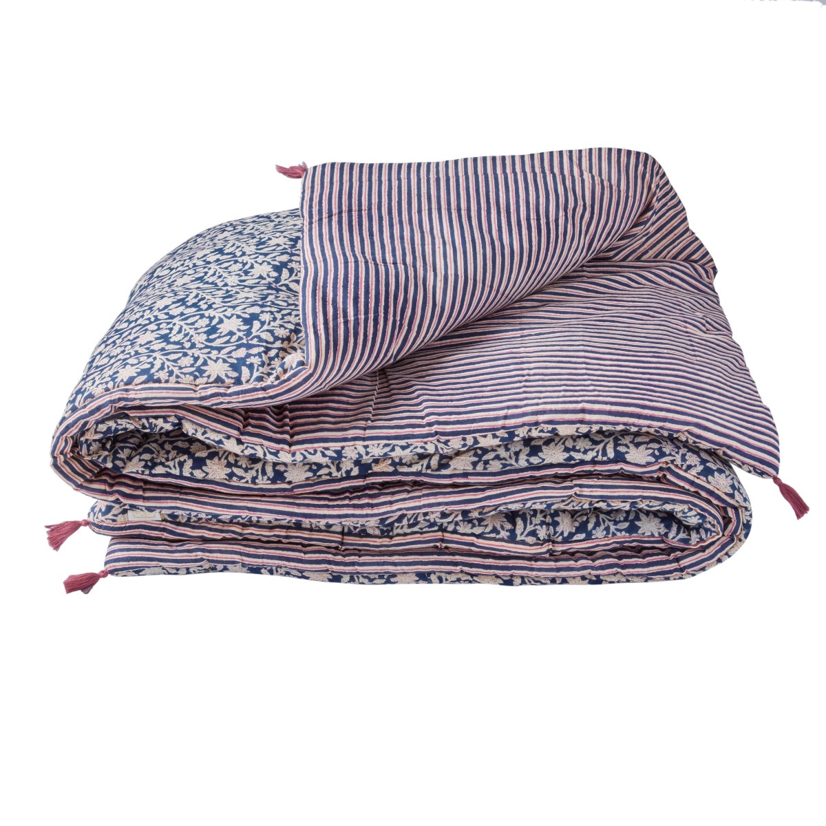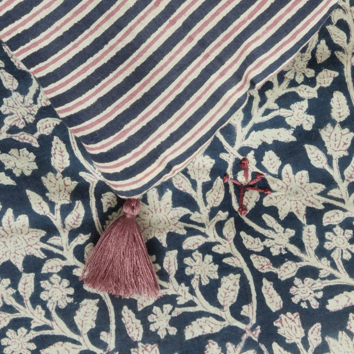 Fleurs indiennes bohèmes, imprimé au block print, révélateur du savoir faire artisanal indien sur une face et velours tout doux sur l’autre face.