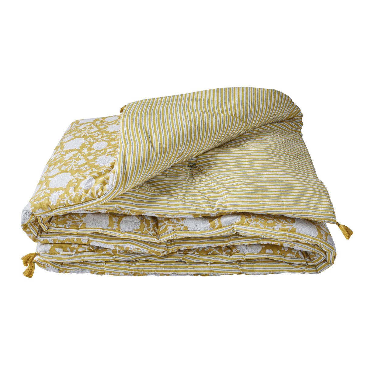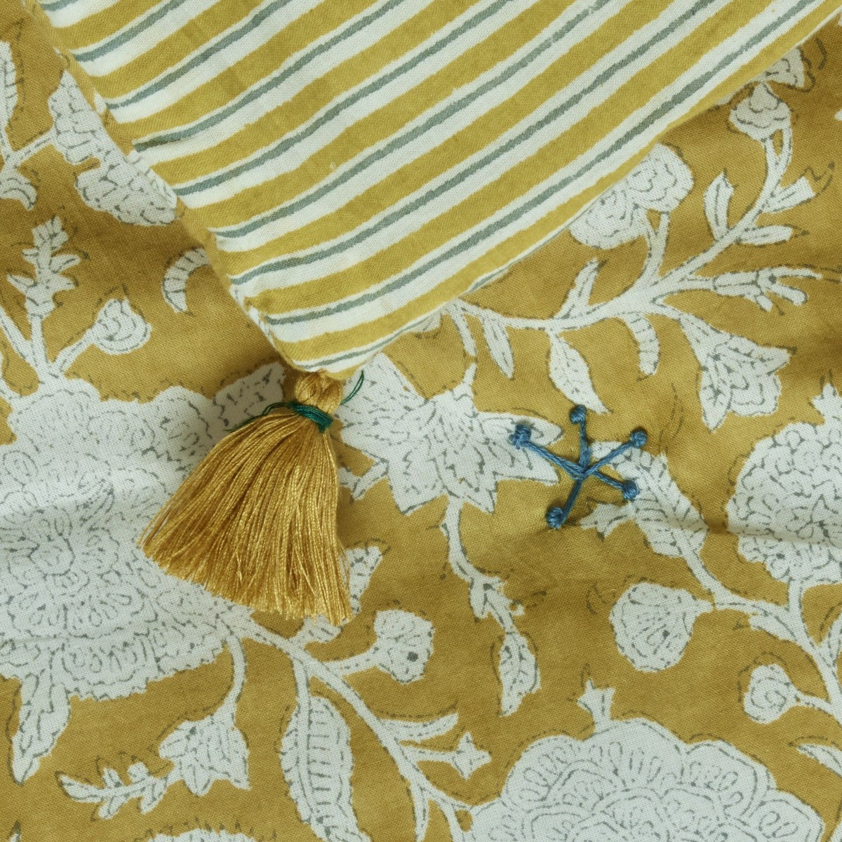 Fleurs indiennes bohèmes, imprimé au block print, révélateur du savoir faire artisanal indien sur une face et velours tout doux sur l’autre face.